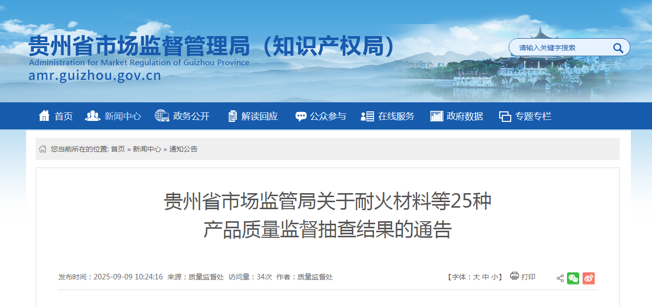中国质量新闻网讯 近日,贵州省市场监管局发布关于耐火材料等25种产品质量监督抽查结果的通告。